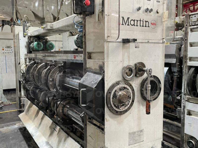 We present MARTIN 1224 3 COLOR FLEXO FOLDER GLUER INLINE WITH ROTARY DIE CUTTER, max format 1100mm x 2460 mm / 43.30" x 96.85", manufactured in 1995.